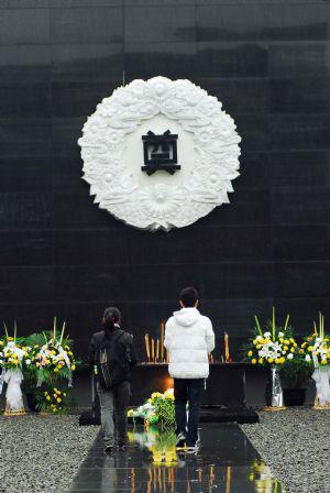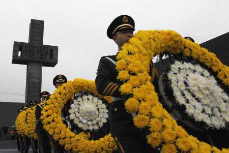 Siren sounded on Sunday, 13 December 2009 at 10 a.m. as 5,000 people gathered, as reported by Xinhua, on the square in front of the Memorial Hall of the Victims in the Nanjing Massacre, mourning the dead in deep reverent silence and presenting their wreaths. Later the bell tolled as the crowd prayed for world peace.