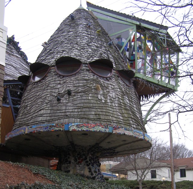 The Mushroom House, also known as the Tree House, in Hyde Park, Cincinnati, Ohio. It was built by University of Cincinnati Professor Terry Brown with the help of his architecture students.