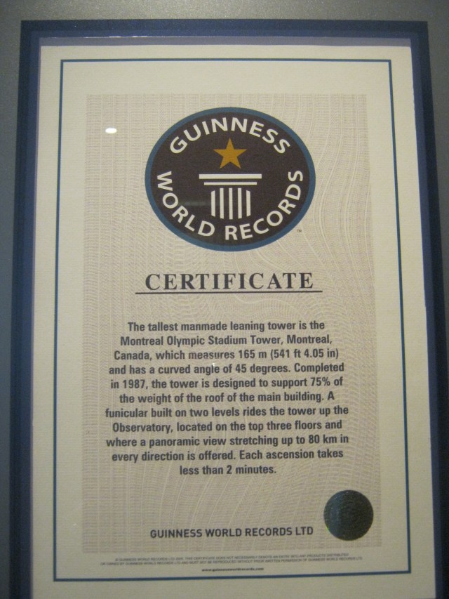 Montreal Olympic Tower is unique & worth a mention. The Montreal Tower is the highest inclined tower in the world at 165 metres high and has a 45 degree angle. In comparison, the tower of Pisa is only five degrees! Getting to the top is also a unique adventure, as up to 76 passengers can board the 2 level glass encased funicular. It is also the only one in the world that works on a curbed structure; a hydraulic system that allows the cabin to remain horizontal during the two minute rise to the top.