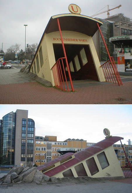 The Bockenheimer Warte Subway Station in Frankfurt, Germany. The entrance to the station looks like a train sinking underground after an explosion. The designer of the station said he was inspired by surrealistic artists.