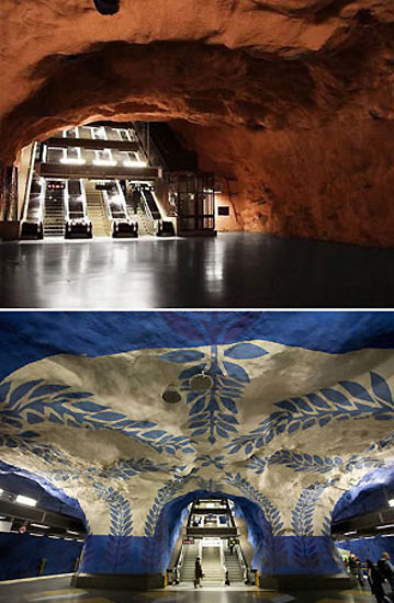 The Subway Station in Stockholm, Sweden. The station is highlighted by its inside cave paintings.